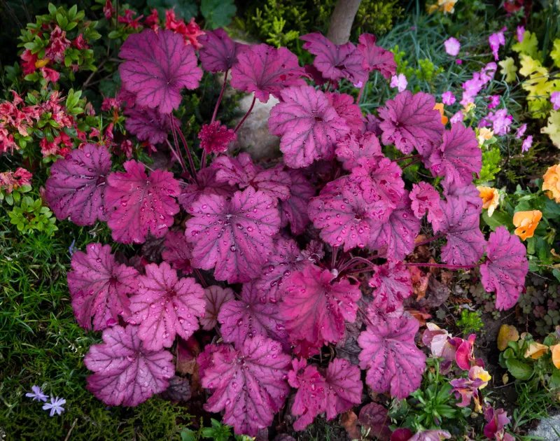 Part of the acclaimed Dolce® series bred for superior performance, ‘Wildberry’ forms a lush, compact mound of overlapping foliage that remains vibrant from spring through fall. In late spring to early summer, delicate spires of small bell-shaped flowers rise above the foliage on burgundy stems, adding an extra dimension of interest—though it’s the spectacular foliage that truly steals the show. The intense coloration is most vivid in cool weather, deepening to rich plum tones that create striking contrasts in mixed plantings.